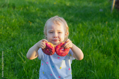 Beautiful baby girl 2 years old closes her eyes with two pink donuts in the summer in nature