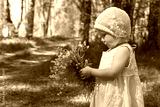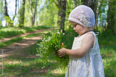 Cute baby girl in white dress and panama hat in summer holds a bouquet of delicate wildflowers in the forest