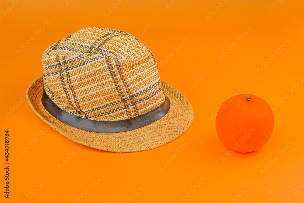 Men's hat for summer holidays and decorative orange on an color background close-up