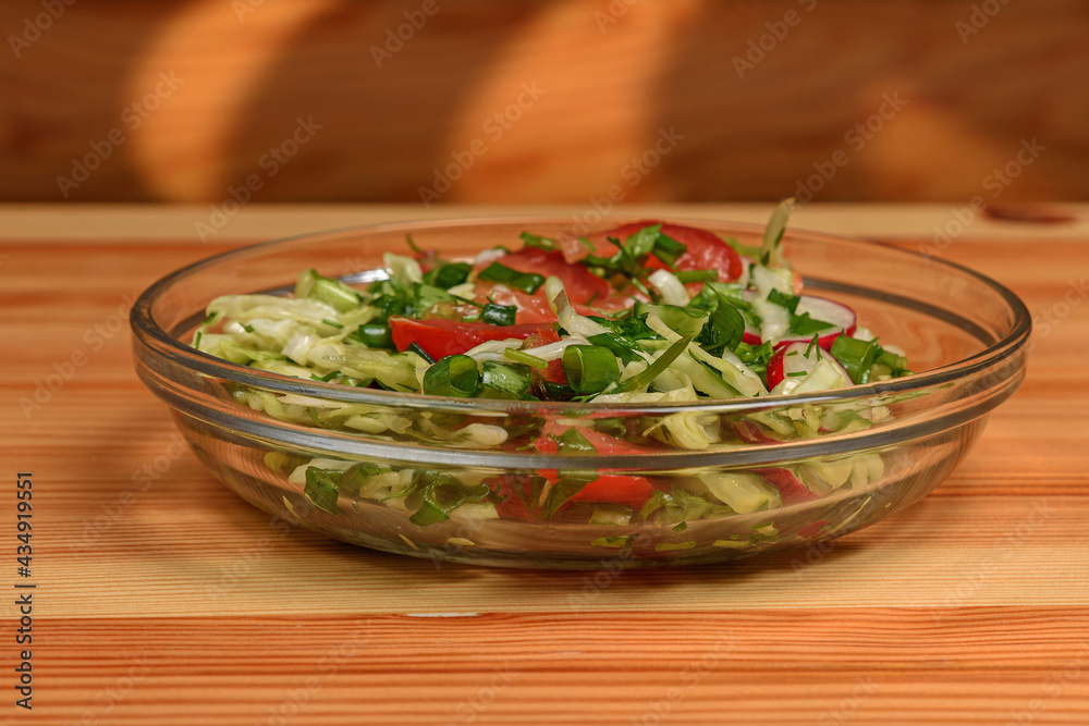 Vegetable salad in a glass plate on a wooden background close-up