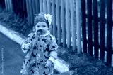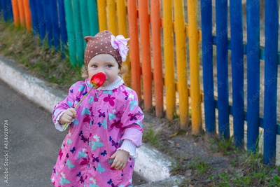 A cheerful girl child a girl in a beautiful hat with a pink flower walks in the spring along the sidewalk along the rainbow fence with a red tulip flower in her hand