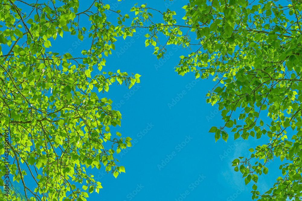 Frame of deciduous tree branches on the background of the spring sky