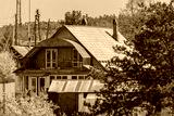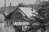 Fragment of the facade of a village house with an attic on a sunny spring day