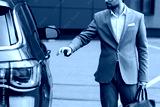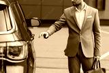 partial view of man in beige suit and glasses reaching car door