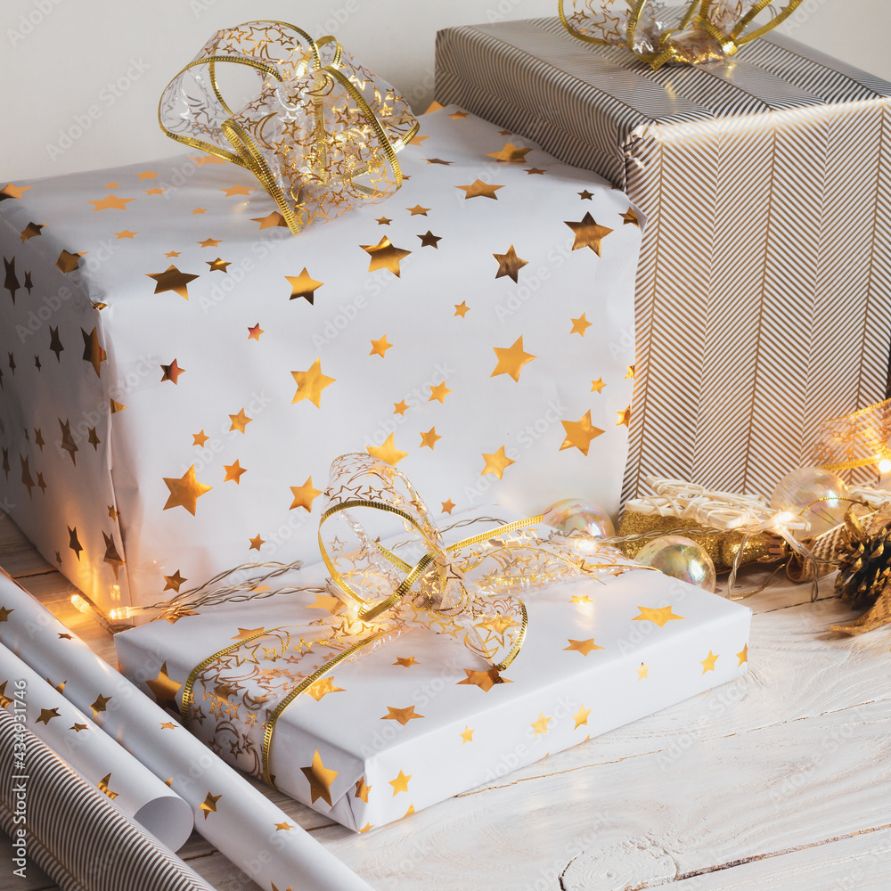 Preparing for the celebration of Christmas. Christmas gifts are wrapped in gold and white paper with golden stars