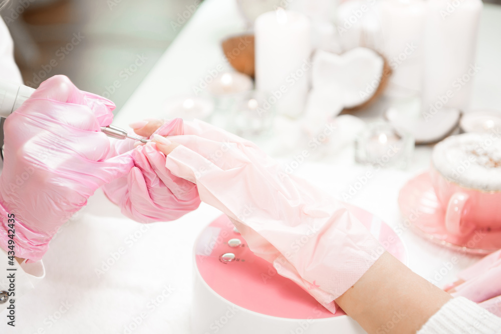 Woman use electric nail file drill in beauty salon. Perfect nails manicure process in close up.