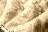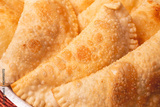 Pastel, Comida brasileira. Um grupo de pastéis fritos servidos à mesa. Foto com visão do topo e de ângulo fechado. O pastel é um tipo de alimento recheado com massa de farinha de trigo frito no óleo.
