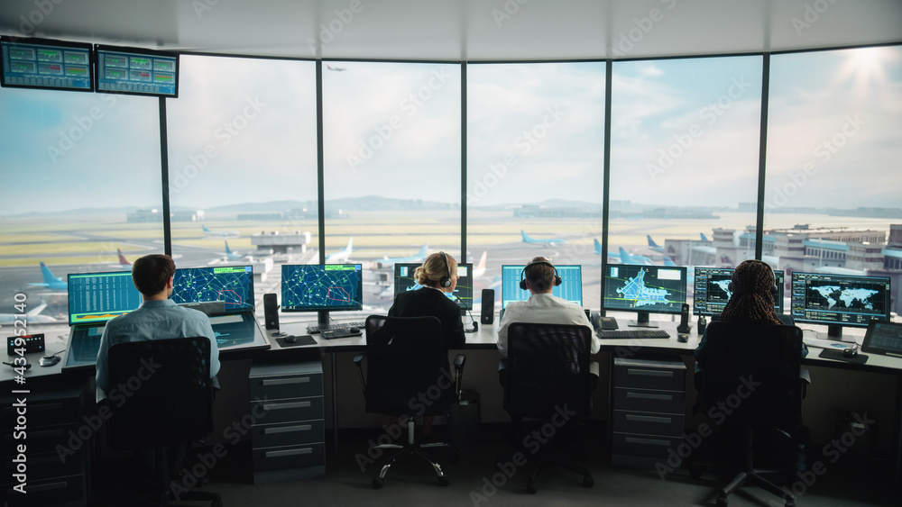 Diverse Air Traffic Control Team Working in a Modern Airport Tower. Office Room is Full of Desktop Computer Displays with Navigation Screens, Airplane Departure and Arrival Data for Controllers.