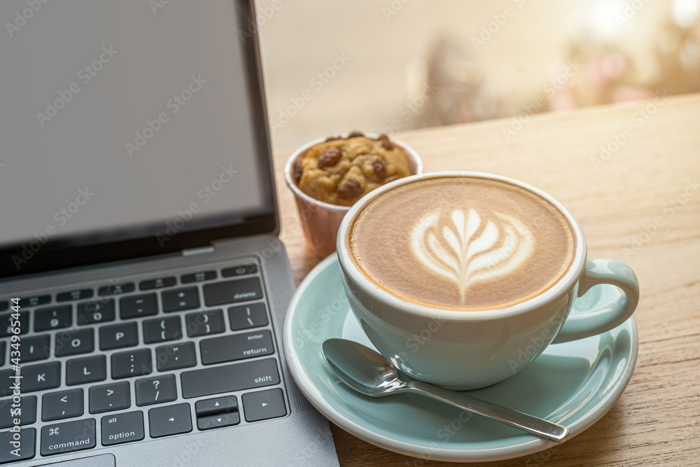 Close-up of Hot coffee latte with latte art milk foam in cup mug and Homemade Banana cup cake with laptop computer on wood desk office desk in coffee shop at the cafe,during business work concept