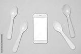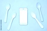 Mobile phone mock up nd Kid spoons in different colors laid on sweet pink pastel background, a set of colorful spoons, pastel palette spoons and technology