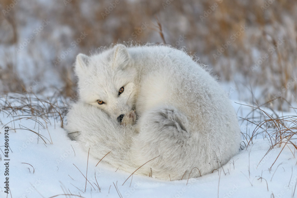Wild arctic fox in tundra. Arctic fox lying. Sleeping in tundra.