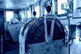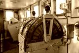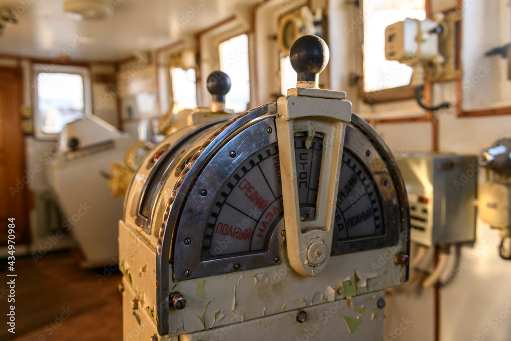 Navigational bridge on abandoned vessel. Old derelict ship wheelhouse. Ship's control device. Russian words: Ahead/Astern, full, half, slow, dead slow, stop, stand by.
