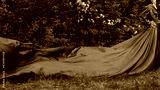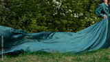 A girl in green in a silk dress with a very long train on the background of flowering trees. Copy space.
