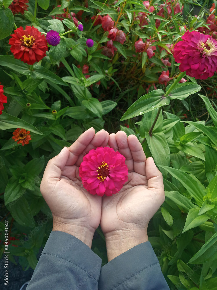 Red flower in hands. Top view of young woman hand holding pink flower in hand on green plant leaves background. Love receive and acceptance, fragility and protection concepts.