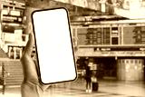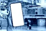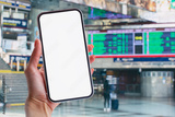 Mockup of a smartphone with a white screen close-up against the background of the timetable at the railway station.
