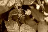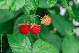 Ripe red raspberries in dewdrops ripened on a raspberry bush in summer