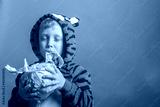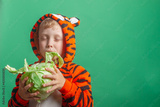 The concept of vegetarianism. A boy in a tiger predator costume eats only vegetables cabbage