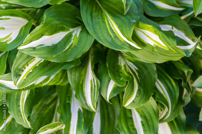 Contrast in nature. White green leaves hosta on the plant