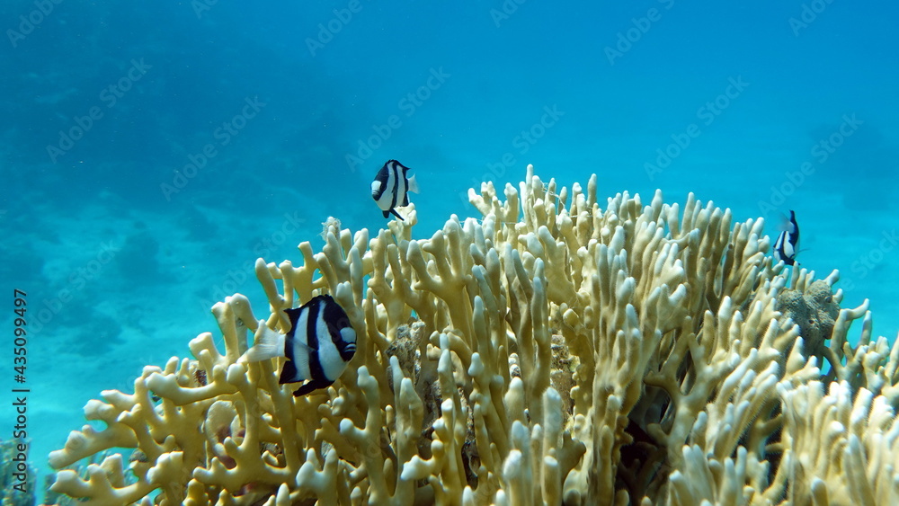 Fishes. Whitetail dascyllus. Fish - a type of bone fish Osteichthyes. Pocacentric - Pomacentridae. Zebra-like dascil.