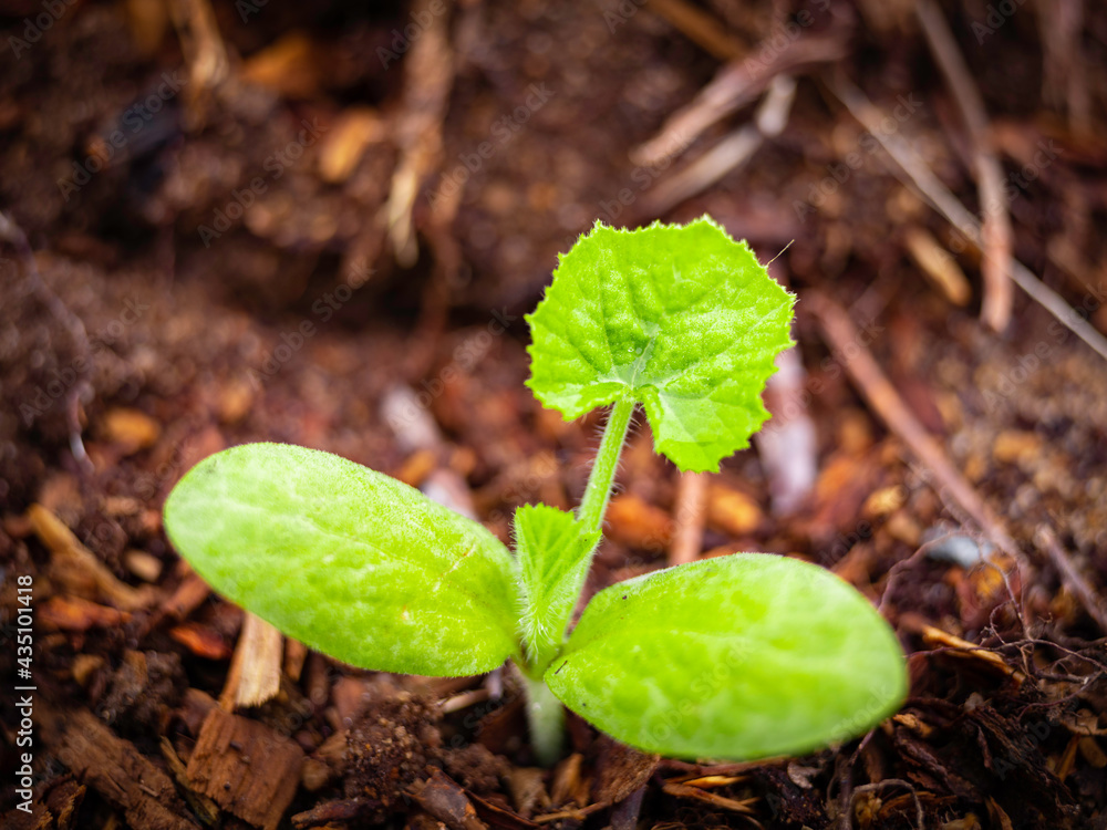 Young Cucumber Plant Sprouts Growing in Compost Layer over Hügelkultur Bed in Springtime