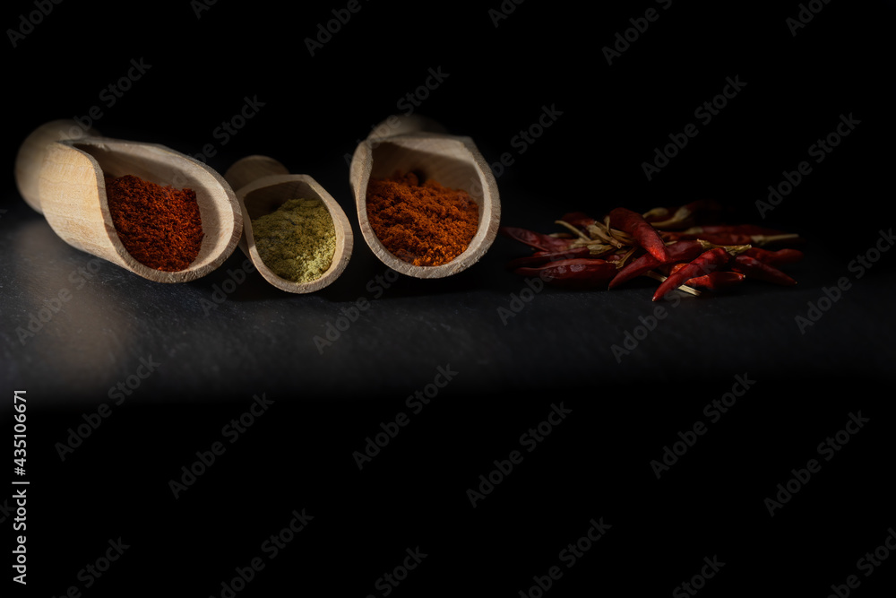 Low key photo of different types of ground chili with dried peppers