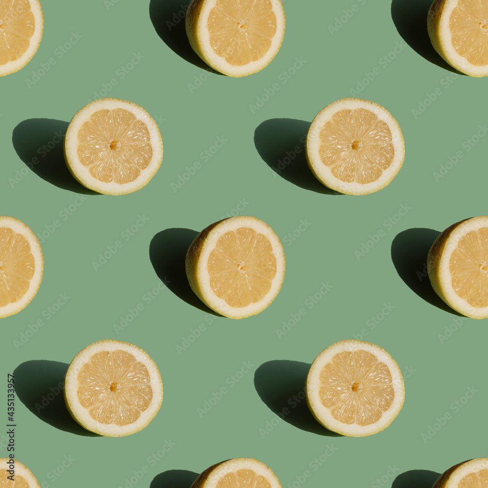 Fruit seamless pattern lemon on green pastel background. Trendy minimal sunlight summer concept.