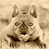 2-Years-Old Blue Brindle French Bulldog Female Puppy Lying on Gravel and Panting. Off-leash dog park in Northern California.