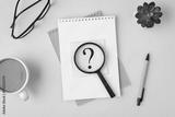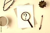Top view photo of sticker with question mark magnifier on two organizers pen glasses plant and cup on isolated beige background