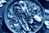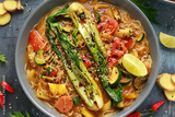 Asian style Pak choi, lemongrass, and ginger curried noodles served with lime wedges