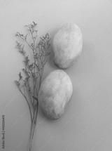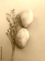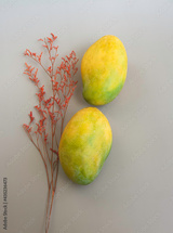 Two Indian Mangoes put beside red dried flower,