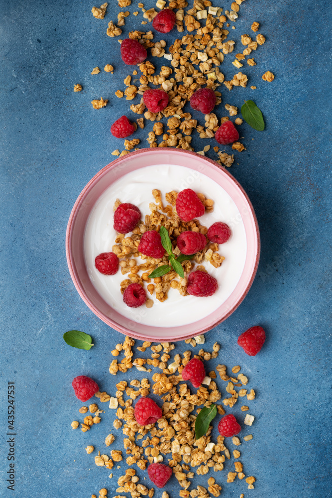 Greek yogurt with raspberries and granola. Top view flat lay. Healthy breakfast.