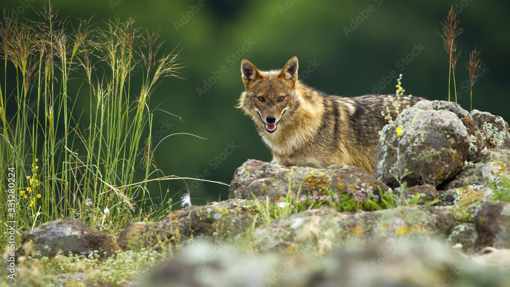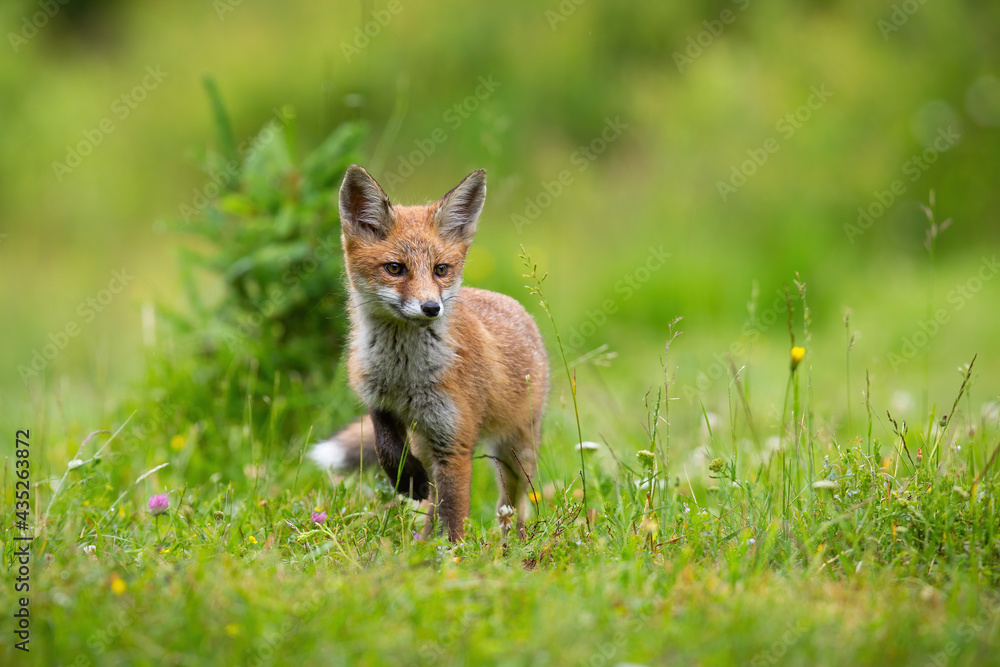 Little red fox, vulpes vulpes, puppy walking on blooming glade in summer. Young mammal moving on meadow in sunlight. Orange cub marching on blossom grassland.