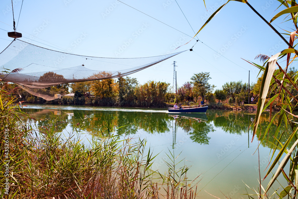 Ravenna, Emilia Romagna, Italy: landscape of the river with fishing huts and boat in the nature reserve Po Delta Park