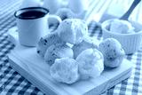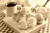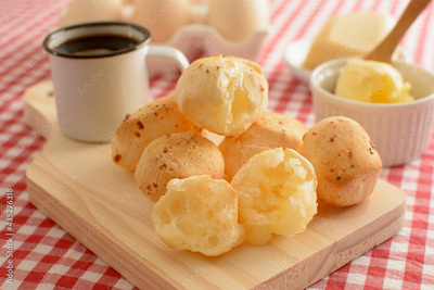 Minas Gerais cheese bread, hot, with a cup of black coffee and butter, on a checkered picnic tablecloth