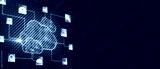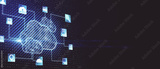 Cloud service and internet of things concept with dark blank wallpaper with digital cloud symbol and technological icons. 3D rendering, mockup