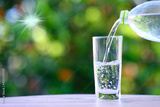 Water from bouttle pouring into glass on wooden table and mineral water health care concept, space for text