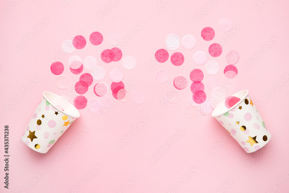 Eco paper glasses with pink confetti on pink color background minimal style. Flat lay composition for birthday, mother day or wedding holiday