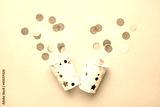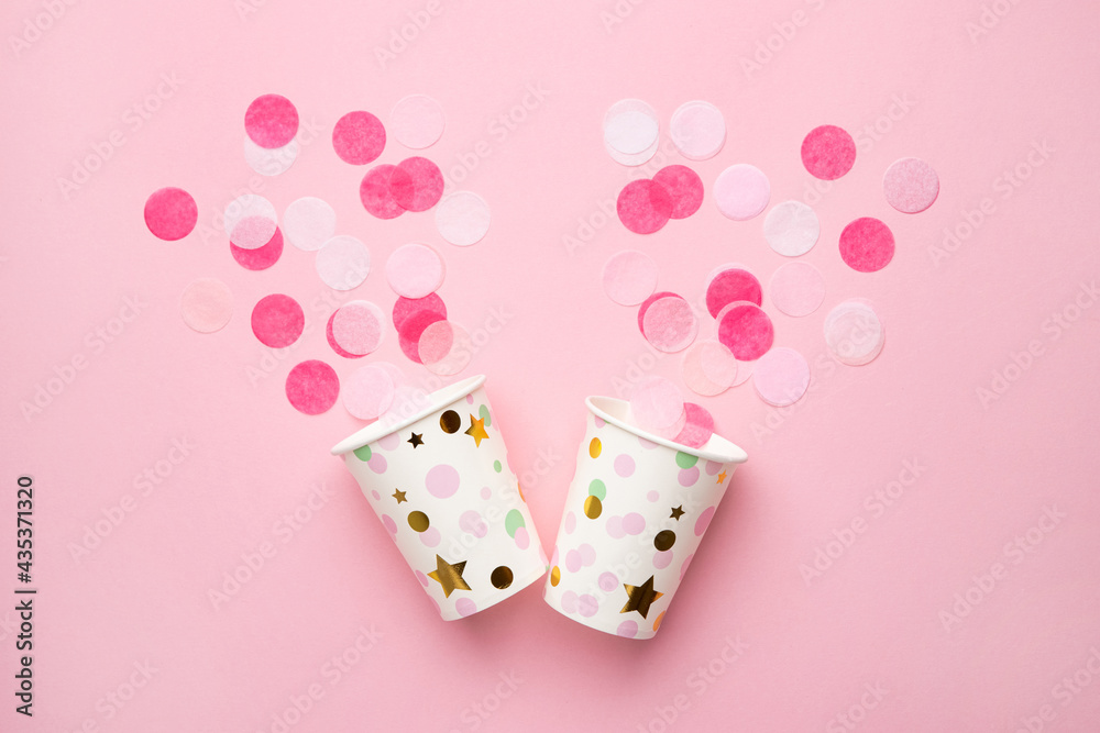 Eco paper glasses with pink confetti on pink color background minimal style. Flat lay composition for birthday, mother day or wedding holiday