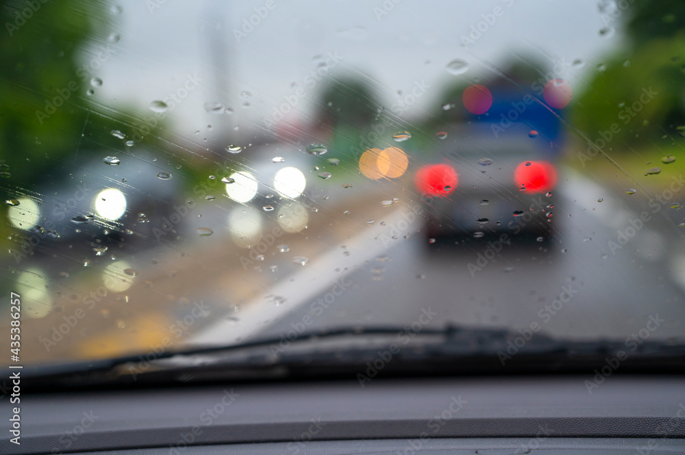 Car driving in the rain with drops on windshield. High quality photo