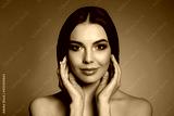 Beautiful young woman with evening makeup on brown background. Eye shadow product