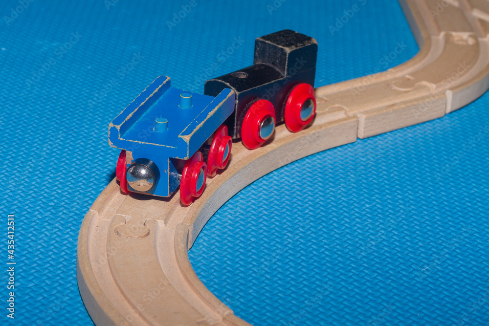 Wooden toy train with a wagon on a wooden railway in the children's playroom as a toy for boys and girls