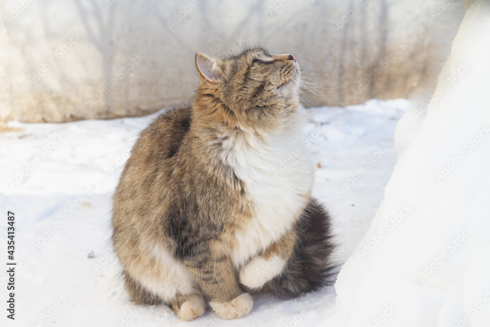 Fluffy homeless cat brown color alone sit on the snow in winter