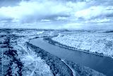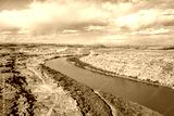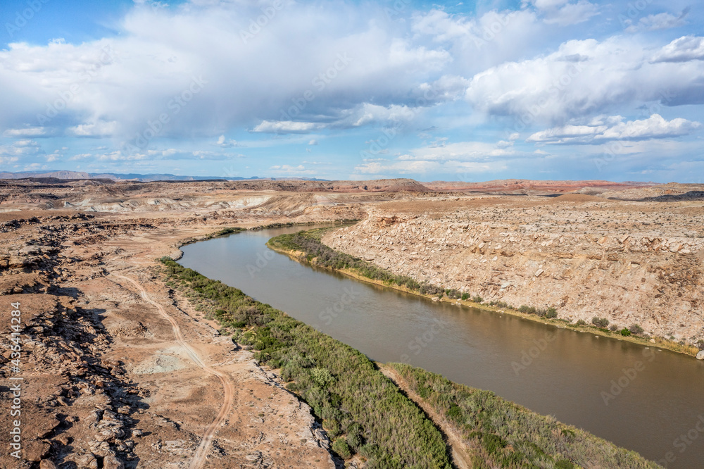 aerial view of Green River flowing below town of Green River in Utah
