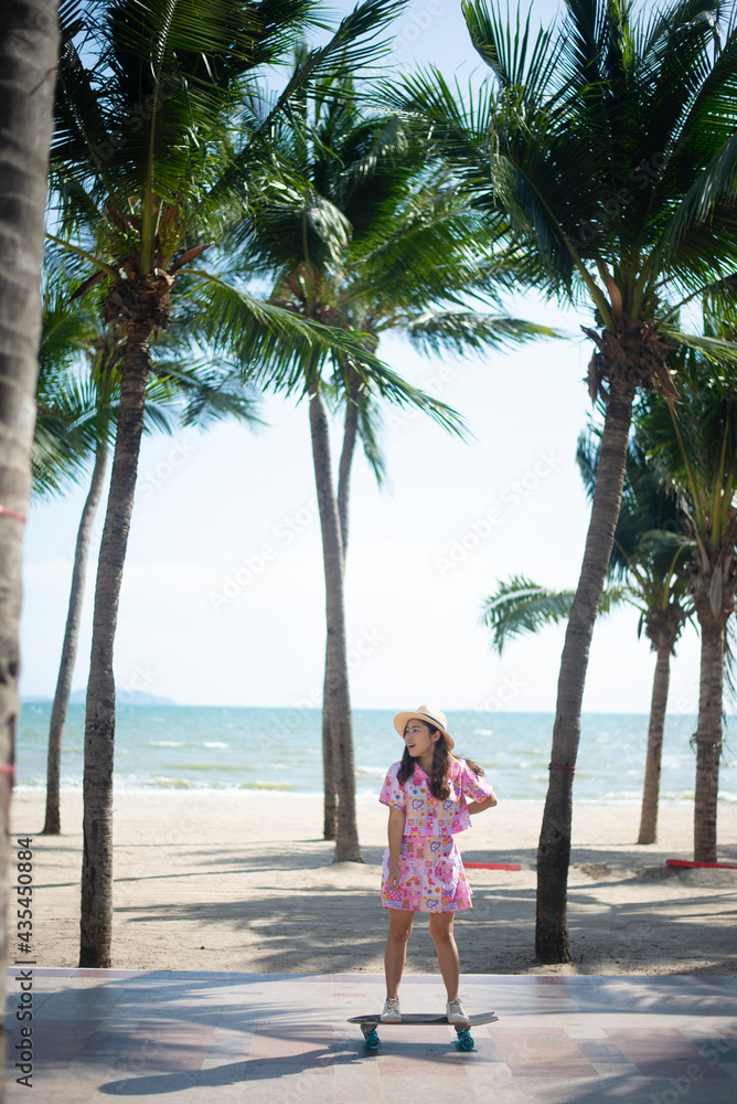Asian woman on surfskate or skate board in front of coconut palm trees on blue sky background at the beach.