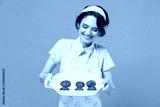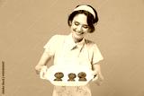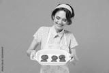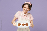 Young smiling housewife housekeeper chef cook baker woman wearing pink apron show chocolate cookies biscuits on white baking form isolated on pastel violet background. Cooking food process concept