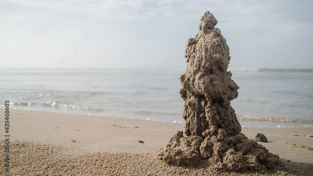 Sandcastle and fog on the beach. Sunny, hot summer day, but cold water. Pavilosta, Latvia.