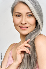 Vertical portrait of gorgeous happy joyful middle aged mature cheerful asian woman, senior older 50s gray haired lady isolated on white. Ads of hair care products for older salon haircare.