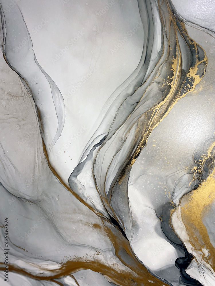 Abstract grey art with gold — black and whited background with beautiful smudges and stains made with alcohol ink and golden pigment. Gray fluid art texture resembles marble, watercolor or aquarelle.