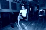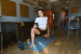 Sporty fitness young woman stretching and exercising at home. Fit girl using smartphone app for working out.