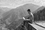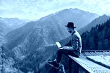 Young man freelancer traveler wearing hat anywhere working online using laptop and enjoying mountains view